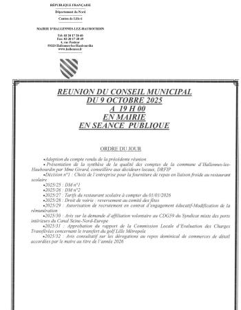 Réunion du conseil Municipal du 9 octobre 2025 à 19h en mairie, en séance publique.